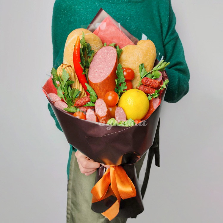 Букет из колбасы, овощей и булочек