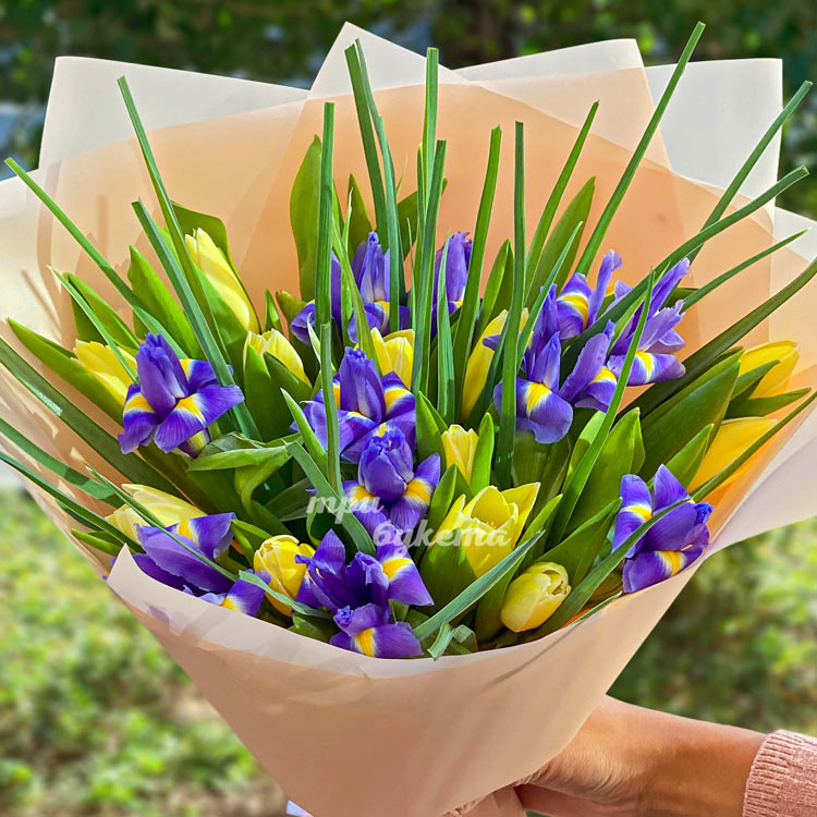 Букет из желтых тюльпанов и ирисов