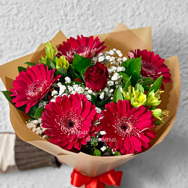 Букет красных гербер с гипсофилой
