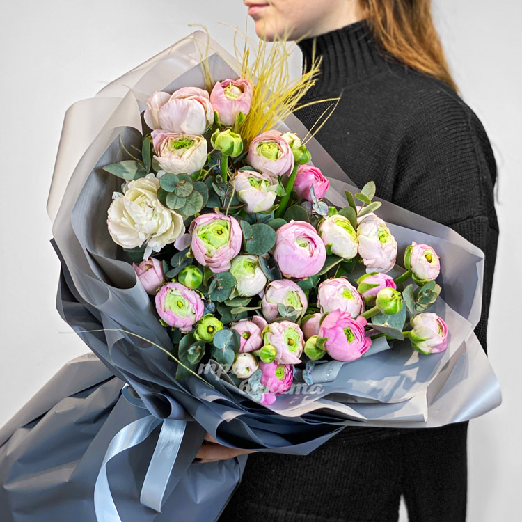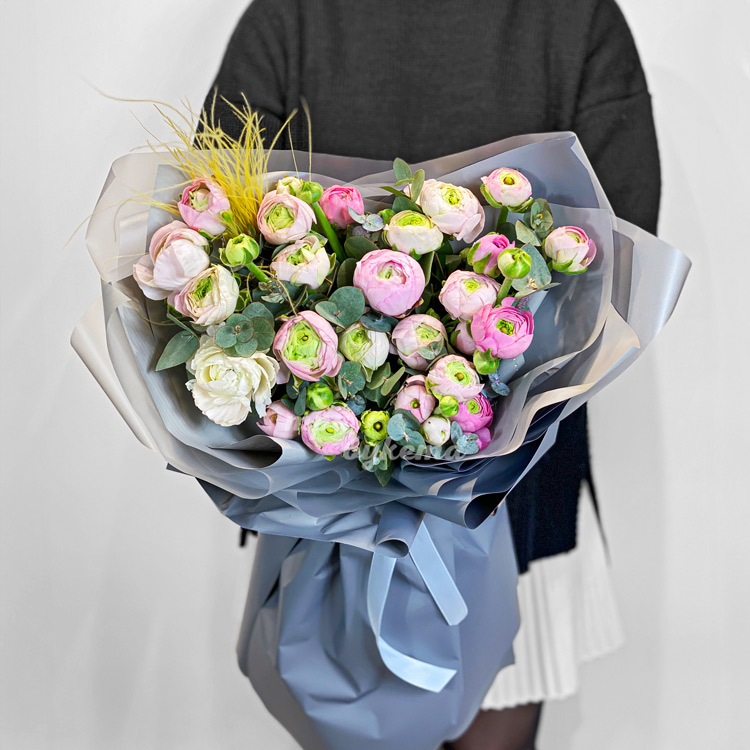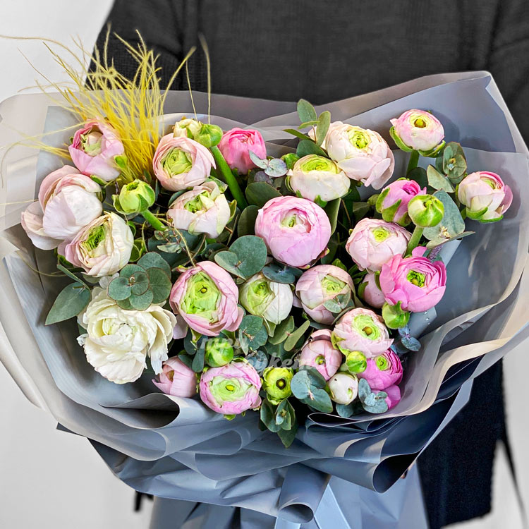 Букет розовых ранункулюсов с зеленью