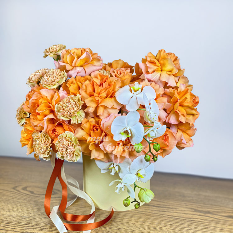Коробка орхидей, гвоздик и роз Шиммер