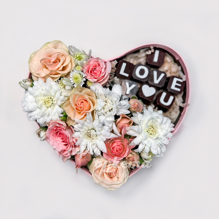 Коробка-сердце из хризантем и роз