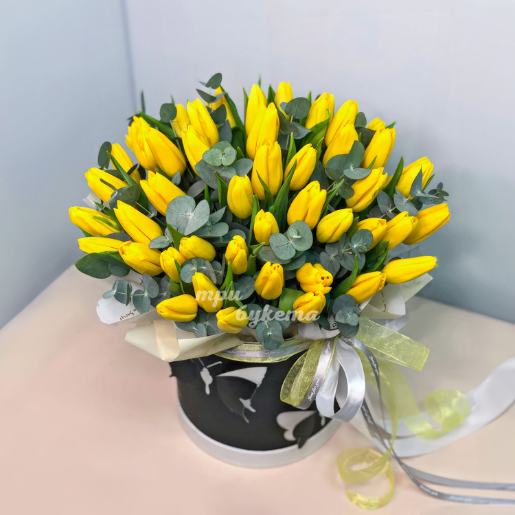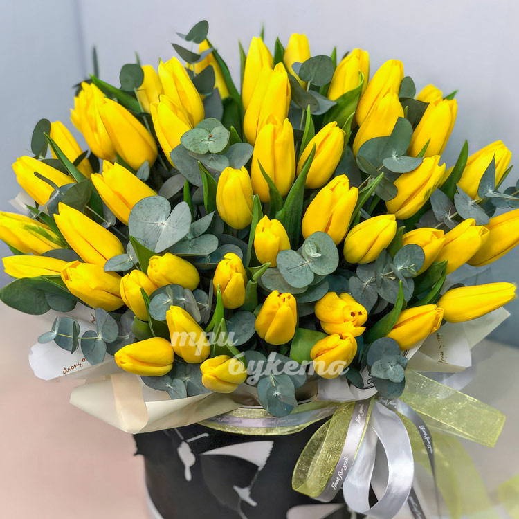 Коробка желтых тюльпанов с эвкалиптом