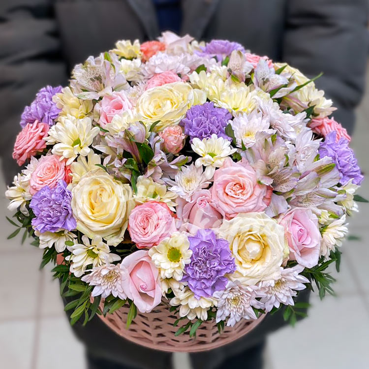 Корзина хризантем, гвоздик и роз