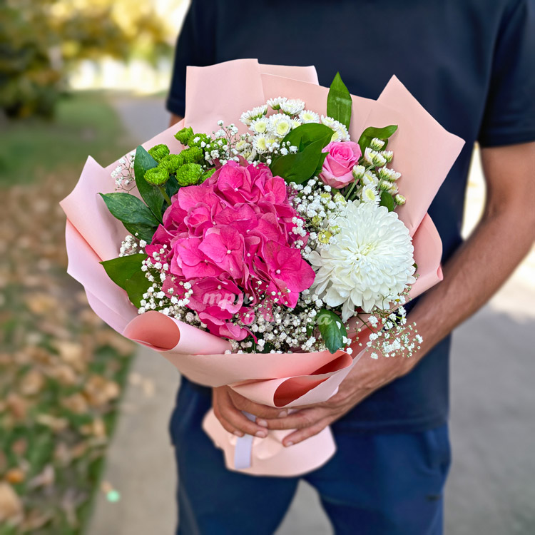 Розовый букет из хризантем и гортензии