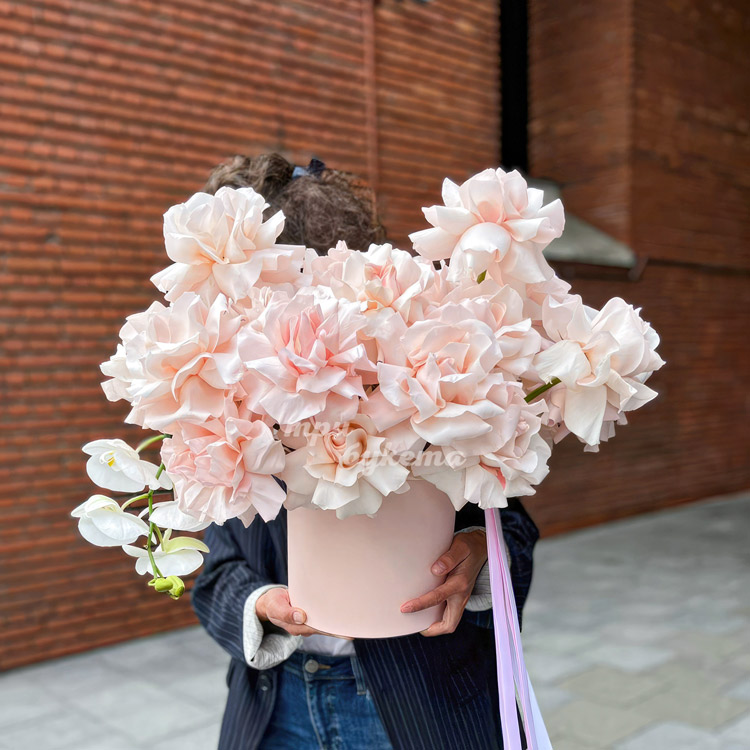 Шляпная коробка кремовых роз с орхидеями