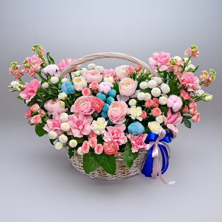 Яркая корзина хризантем, ранункулюсов и роз