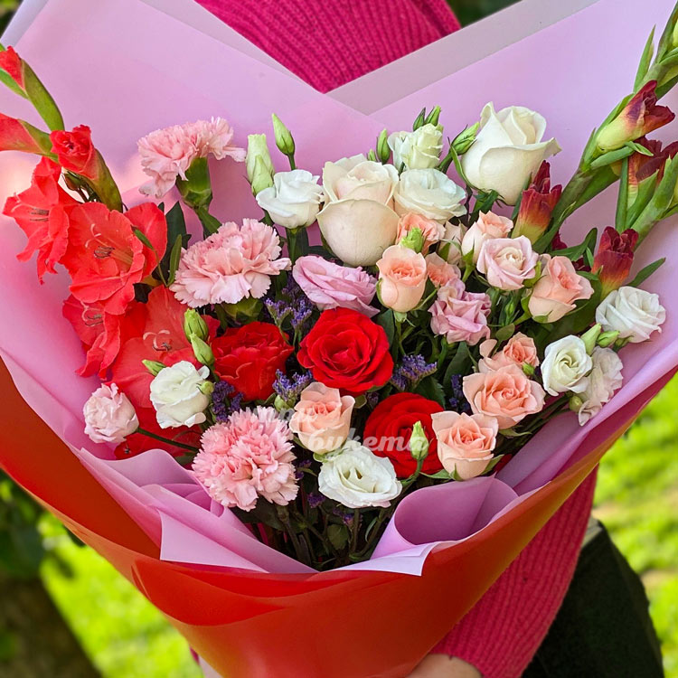 Яркий букет из гладиолусов и роз